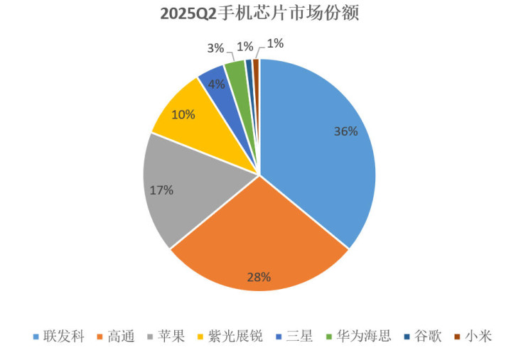 按照媒体公布的2025年2季度的数据,这8大手机芯片厂商的其份额如上图所示,高通第一,份额为36%,再是高通,份额为28%,再是苹果,份额为17%,这三大厂商,拿走了81%。